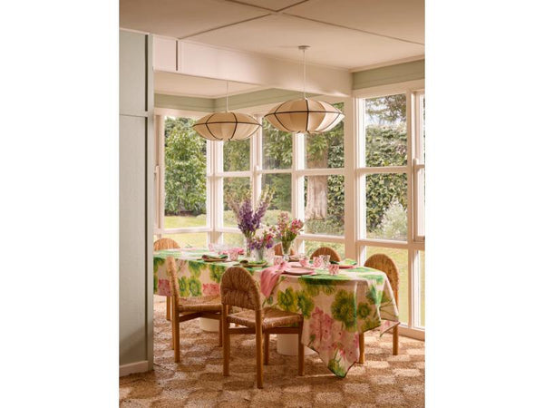 Wild and painterly, this linen tablecloth bursts with overgrown geranium flowers in sun-warmed pink and green. A garden-inspired design that turns every meal into a celebration.