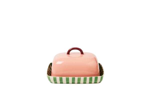 Sweet and satisfying, this pink ceramic butter dish is all about joyful detail, like the soft green striped base, hand-formed handle, and warm blush lid. Made from durable earthenware and painted by hand, it's a pretty way to keep butter out on the counter (and get compliments while you do it).