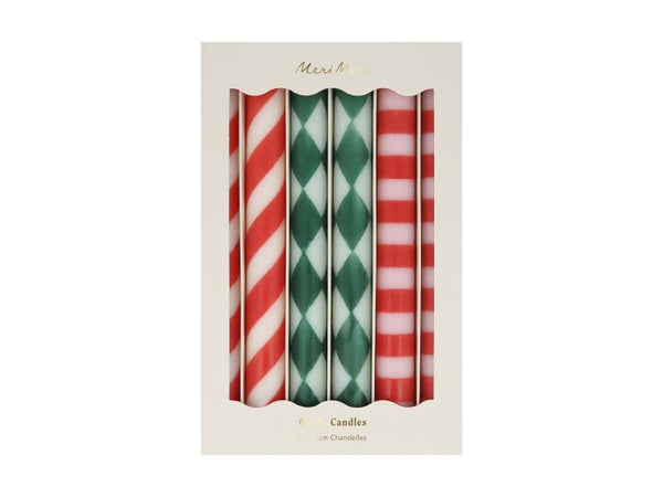 - 6 Striped candles with 3 designs of pink and red, mint and green, and red and ivory