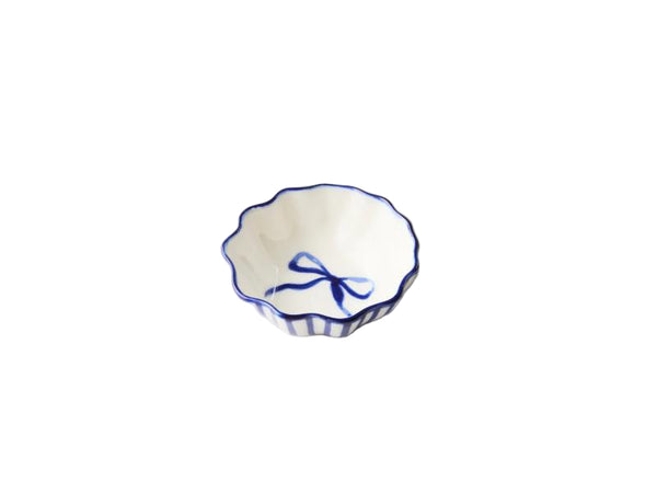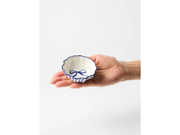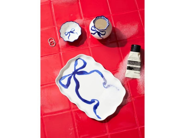 Scalloped edges rise to meet careful brushstrokes of indigo blue in this petite earthenware dish. Designed in Sydney and hand-painted in Vietnam, the Margot Dish cradles your most precious objects rings, earrings, while its ribbon-like decoration transforms average spaces into sanctuaries of whimsical beauty.